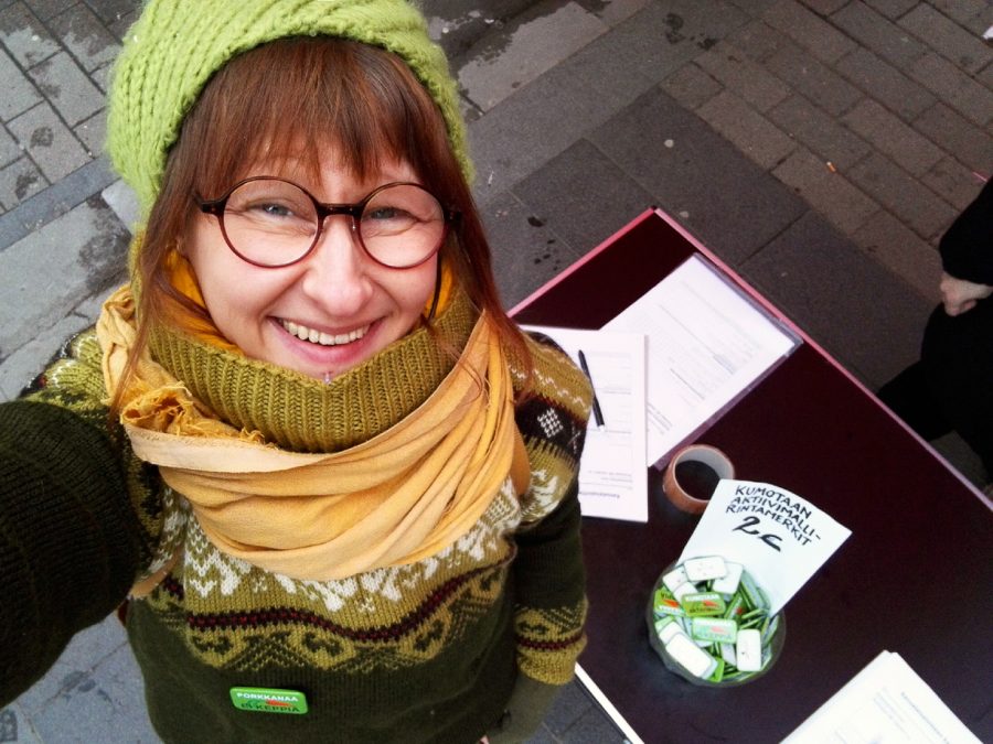 Jyväskyläläinen Minna Koponen on taiteilija ja aktivisti, joka on hallituksen lanseeraaman aktiivimallin myötä kirjaimellisesti aktivoinut itsensä. Hän on ollut kirjastoissa, toreilla ja turuilla keräämässä nimiä kansalaisaloitteeseen, koordinoinut nimenkeruita valtakunnallisesti sekä osallistuu perjantain mielenosoitukseen.