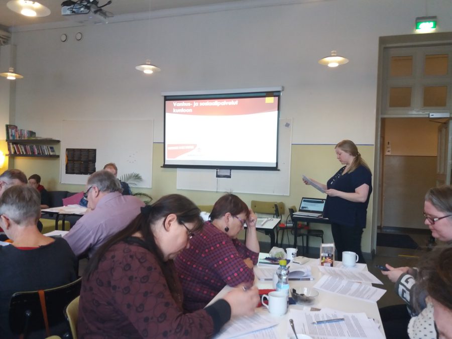 SKP:n pääsihteeri Petra Packalén esitteli kuntavaaliohjelmaa, jonka teemana on: kuntamme ei ole kaupan.