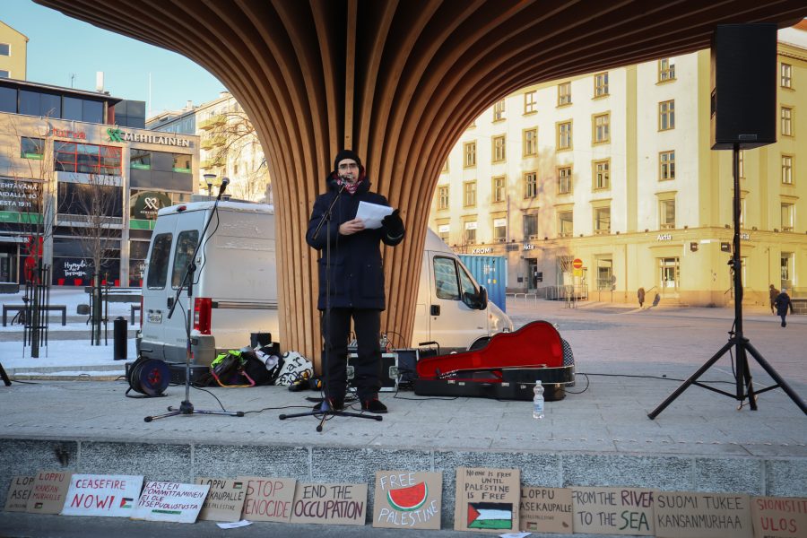 On vuoden kylmimpiä päiviä Suomen Turussa, mutta Kauppatorille on tästä huolimatta kokoontunut satoja mielenosoittajia vaatimaan oikeutta Palestiinaan ja Israelia pysäyttämään harjoittamansa kansanmurhan.