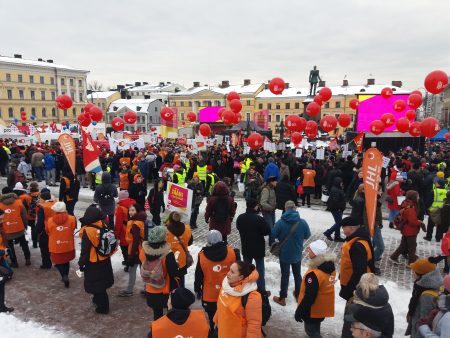 Helsingin Senaatintori ja Tuomiokirkon portaat täyttyivät väestä, kun SAK järjestää parhaillaan mielenosoitusta hallituksen niin sanottua aktiivimallia vastaan.