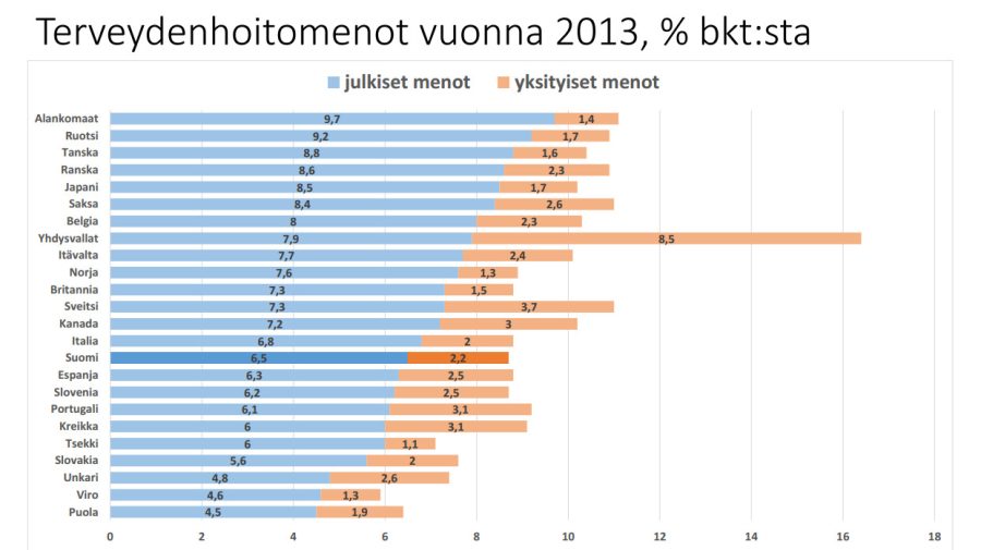 Itse asiassa Suomen terveydenhoitomenot ovat kansainvälisessä vertailussa vähintäänkin kohtuullisella tasolla. Suomi käyttää terveydenhoitoon bruttokansantuotteesta noin 8,7 prosenttia, mikä on läntisen Euroopan alhaisimpia lukuja. Järjestelmämme on siis jo nyt erittäin tehokas.