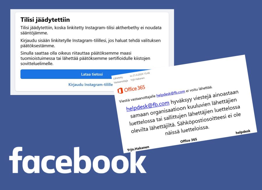 Minulla ei ole tuolla nimellä Instagram-tiliä eikä sellaista edes löydy Instagramista. En siis voinut valittaa kirjautumalla mainitulle tilille. Minulla on Instagramissa omalla nimelläni tili, jota ei ole suljettu. Lähetin sen kautta Metalle selvityksen ja vaadin Facebook-tilini avaamista. En ole saanut mitään vastausta.