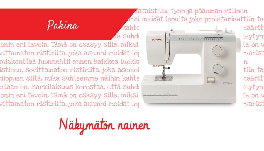 Talven kynnyksellä Näkymätön nainen on vaihtanut kotityöt sisätiloihin ja laittanut ompelukoneen hurisemaan. Ei mitään suurieleistä, vain itse tehtyjä kasvomaskeja niitä tarvitseville ja korjailuja omiin tarpeisiin. Välillä tuon koneen hurina on saanut lähes unohtamaan maailman tilan.