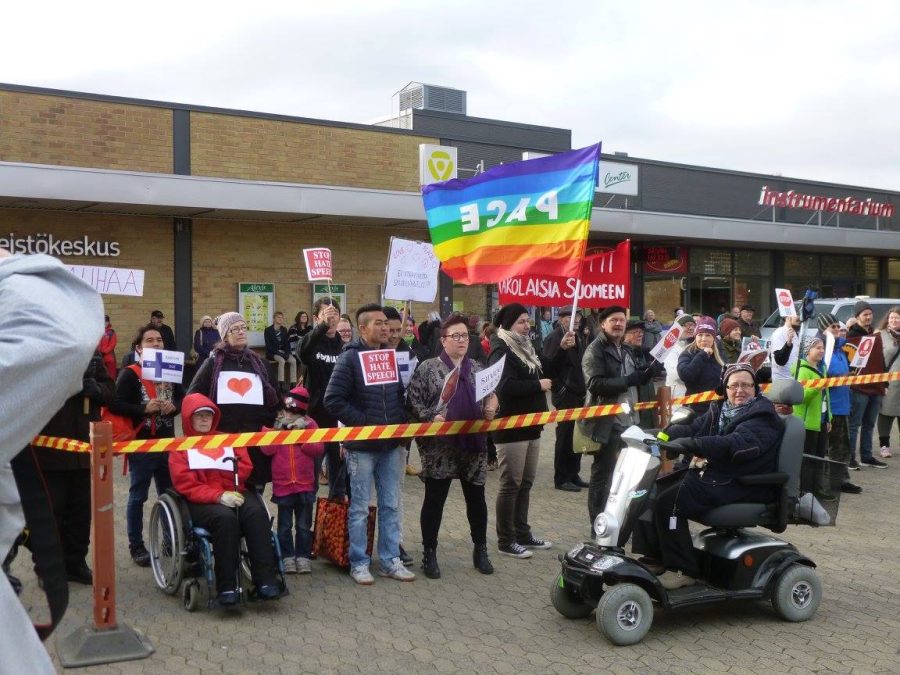 Rasismin vastaisessa mielenosoituksessa oli paikalla lähialueen asukkaita ja rauhanaktiiveja.