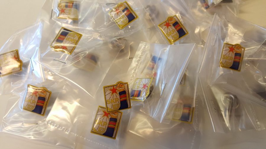 SKP:n vapun 2016 tunnus on ”Alas porvarihallitus!” – ”Borgárráđđehus vulos!” – eli sama pohjois-saameksi.