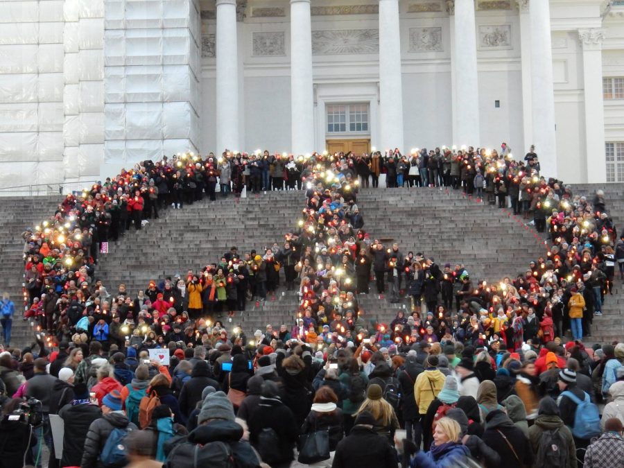 Helsingin Senaatintorilla muodostettiin maanantaina YK:n päivänä ihmisistä koostuva rauhanmerkki. Kuva: Toivo Koivisto.
