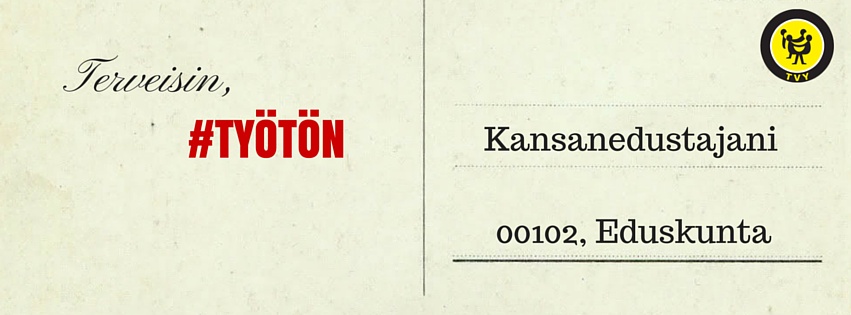 Työttömien valtakunnallinen yhteistoimintajärjestö – TVY ry on jäsenjärjestöineen huolissaan siitä, että Eduskunnassa työttömien yhteiskunnallista asemaa ja hyvinvointia heikennetään romuttamalla aktiivinen työllistämispolitiikka. Postikorttitempauksen on tarkoitus tehdä päättäjät konkreettisesti tietoiseksi sen ajaman työllisyyspolitiikan vaikutuksista työttömien tilanteeseen. Postikortteja satelee viikon aikana TVY:n sadasta jäsenjärjestöstä ja suurin osa on kohdistettu oman vaalipiirin kansanedustajille. Lisäksi tempaus näkyy sosiaalisessa mediassa #työtön #äänityöttömälle –viitteillä.